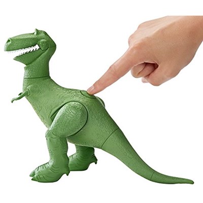 اکشن فیگور دایناسور رکس توی استوری شامل یک فیگور از شخصیت های داستان اسباب بازی های می باشد که یک دایناسور به نام رکس که به رنگ سبز بوده و قابلیت پخش صدا دارد. در پشت عروسک یک کلید وجود دارد که با فشار دادن آن شروع به سخن گفتن می کند که می تواند ۱۱ جمله را بیان کند. این جملات در فیلم نیز بیان شده است. دهان و دست عروسک نیز با حرف زدن حرکت می کند که با فشار دادن کلید پشت عروسک انجام می شود.جنس این دایناسور اسباب بازی از پلاستیک با کیفیت می باشد که از مواد اولیه درجه یک تولید شده است.این فیگور طرح های بسیار خوبی دارد و کاملا شبیه نمونه واقعی خود کاراکتر می باشد. در قسمت سر و دم و پا ها مفصلی وجود دارد که می تواند آن قسمت را با دست تکان داد. این اسباب بازی محصول برند دیزنی می باشد که در بسته بندی جعبه ای شکیل قرار دارد.فیگور حدود 50 سانتی متر طول دارد که ارتفاع آن نیز حدود 30 سانتی متر است. عرض دایناسور حدود 25 سانتی متر است . عروسک با دو باتری قلمی AA انرژی می گیرد که در زیر شکم اسباب بازی قرار گرفته است و بلندگو نیز در کنار محل باتری قرار گرفته است.
