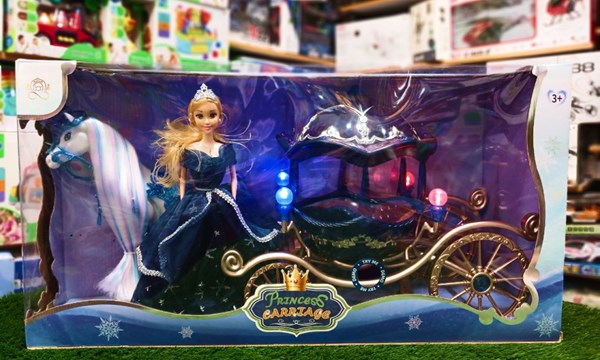 کالسکه اسباب بازی به همراه اسب یکی از اسباب بازی های دوست داشتنی و جذاب برای دختر خانوم ها می باشد. کالسکه اسباب بازی پرنسس شامل یک اسب و یک کالسکه بسیار زیبا و یک باربی است. این کالسکه اسباب بازی برای یک عروسک باربی استاندارد با قد 29 سانتیمتر طراحی شده است.در هر چهار طرف کالسکه اسباب بازی چراغ هایی به مانند فانوس قرار داده شده است که به فشردن کلید آن روشن می شوند و نور زیبایی از خود پخش می کنند. پاهای اسب این مجموعه بصورت ثابت است و کودک با بلند کردن و کشیدن آن به سمت جلو ، کالسکه را به دنبال اسب حرکت می دهد. کودک می تواند درب قسمت جلوی کالسکه که به مانند پله می باشد را باز نماید و عروسک باربی پرنسس اسباب بازی را درون آن قرار دهد. جنس بدنه اسباب بازی کالسکه پرنسس از پلاستیک باکیفیت و براق ساخته شده است و کودک می تواند از بازی با آن لذت ببرد.عروسک باربی پرنسس اسباب بازی از جنس تمام گوشتی و باکیفیت می باشد. مفصل های دست این عروسک از کتف و از قسمت پا نیز از ران قابلیت جابجایی و حرکت دارند. موهای عروسک نیز باکیفیت بصورت کاشته در سر عروسک باربی می باشد. صورت عروسک باربی پرنسس نیز از جنس گوشتی و نرم و باکیفیت ساخته شده است.لباس های این عروسک باربی عروس از جنس پارچه خوب و با ظرافت دوخته شده است. عروسک اسباب بازی باربی پرنسس دارای کفش پاشنه بلند نیز است که براحتی در پای عروسک قرار می گیرد و ثابت می شود.