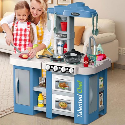 کودکان بیشتر به اسباببازیهایی که شبیه وسایل خانه هستند علاقه دارند، زیرا خود را مادرشان میدانند و این برایشان بسیار جذاب است. یکی از این اسباب بازی های مهیج دخترانه ست آشپزخانه کودک چراغ دار می باشد که مجموعه ای از وسایل آشپزخانه کودکان شامل گاز و وسایل آشپزخانه مانند قابلمه، چنگال، قاشق، کفگیر، انواع ظروف، فنجان و … می باشد تا زمانی که آشپزخانه کامل شود. این ست آشپزخانه اسباب بازی کودک چراغ دار دارای محل آویزان وسایل و قابلیت بازکردن در فر و چرخاندن دسته گاز می باشد. در این ست آشپزی در کابینت ها باز و بسته می شوند و گاز دارای جلوه های نوری و صوتی جذاب می باشد و با چرخاندن آنها چراغ زیر شعله گاز روشن میشود با ریختن کمی آب درون شعله گاز بخار آب تولید می شود که نقش پذیری و داستان سرایی را برای کودک دو برابر می کند. با روشن شدن چراغ صدا نیز به گوش میرسد که حس خوب آشپزی و خاله بازی را به کودک میدهد. شیر آب آشپزخانه اسباب بازی کودک با کمک 3 عدد باتری قلمی قابل استفاده است و قابلیت ریزش آب دارد. به اجاق آن 3 عدد باتری قلمی میخورد که دارای صدای بخار و نور قرمز برای واقعی جلوه دادن آشپزی کودکان است. آشپزخانه کودک بزرگ موزیکال دارای چندین قابلیت فوق العاده میباشد که کودکان و حتی بزرگسالان را به وجد می آورد. این آشپزخانه کودک تمامی امکانات و انواع اسباب بازی وسایل آشپزخانه که کودکان دوست دارند را در خود جای داده است. درون گاز آب بریزید تا شاهد بخار کردن گاز بشید و حس واقعی آشپزی رو تجربه کنید.