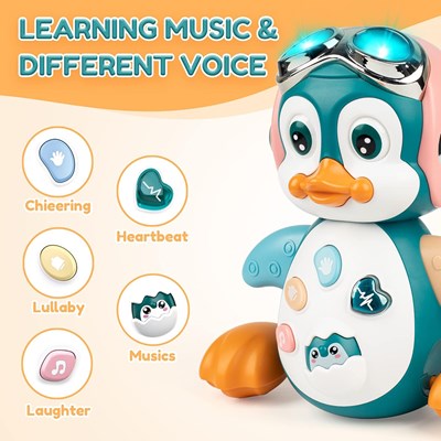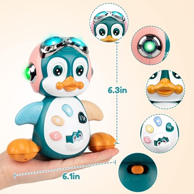 اسباب بازی موزیکال پنگوئن با طراحی بامزه و نورهای LED رنگارنگ، لحظاتی شاد و سرگرمکننده را برای کودک فراهم میکند. این اسباببازی دارای ۵ دکمه با صداهای متنوع مانند لالایی، خنده و صدای حیوانات است و دکمه قلبی آن با پخش صدای ضربان قلب، موجب آرامش نوزاد میشود. برای عملکرد نیاز به ۳ عدد باتری قلمی دارد (در جعبه موجود نیست) و از پلاستیک مقاوم و باکیفیت ساخته شده است. مناسب برای کودکان بالای ۱۸ ماه میباشد.
