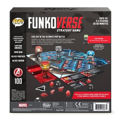 برد گیم فانکو مارول 4 عددی یک بازی هیجانانگیز و کلکسیونی از دنیای ابرقهرمانان مارول است که شامل 4 فیگور فانکو پاپ از شخصیتهای محبوب مرد آهنی، کاپیتان آمریکا، بیوه سیاه و پلنگ سیاه به همراه پایه نگهدارنده میباشد. این بازی برای 2 تا 4 نفر طراحی شده و زمان آن بین 20 تا 60 دقیقه متغیر است. هر فیگور حدود 9 سانتیمتر ارتفاع دارد و امکان بازی به 4 روش مختلف وجود دارد. در بسته این مجموعه، 4 کارت شخصیت، 6 تاس، 21 الماس امتیازشمار، 9 توکن توانایی، 3 توکن انرژی، 4 کارت و 4 توکن ساده به همراه 2 ابزار پایگاه داده، کیس ویبرانیوم، 2 کارت، 2 برگ سناریو بازی و یک صفحه بازی دورو قرار دارد. این بازی قابلیت ترکیب با سایر بردگیمهای گروهی فانکو را دارد و به صورت دو زبانه (انگلیسی و فرانسوی) عرضه میشود. محصول کمپانی آمریکایی Funko بوده و برای افراد بالای 10 سال مناسب است.