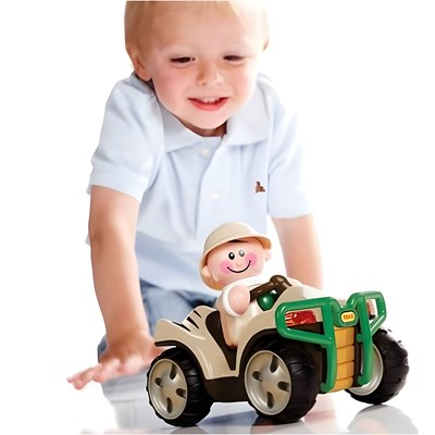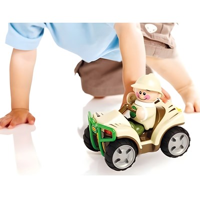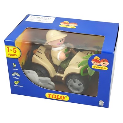 ماشین عقب کش سافاری TOLO بدون باطری کار می کند، به این ترتیب که با کشیدن خودرو به سمت عقب ماشین با سرعت به جلو حرکت می کند. به همراه این اسباب بازی موزیکال یک عروسک پسرک گردش گر هم ارائه شده است. این اسباب بازی محکم و بادوام است و قدرت تخیل و خلاقیت کودک را پرورش می دهد.ماشین و راننده را به عنوان اولین دوستان کودک به او معرفی کنید و اجازه دهید کودک مستقلا و به تنهایی با اسباب بازی آشنا شده و کارکرد بخش های مختلف آن را ببیند. البته راهنمایی کودک و نشان دادن کارکردهای اسباب بازی به او اشکالی ندارد. به او نشان دهید که چرخاندن قسمتهای مختلف چگونه صدا تولید می کند و یا اینکه چطور با عقب کشیدن ماشین چرخهایش شروع به حرکت می کند. نکته بسیار مهم این است که بعد از هر تلاش موفق کودک برای تولید صدا و یا به حرکت در آوردن ماشین او را بسیار تشویق نمایید تا باعث ارتقاء اعتماد بنفس کودک شود.ماشین را روی کف قرارداده و با عقب کشیدن آن را به حرکت درآورید. کودک را تشویق کنید که ماشین را تعقیب کند و به تنهایی این کار را تکرار نماید. با کودکان بزرگتر در مورد نحوه کار ماشین و کارهایی که می تواند بکند صحبت کنید. در مورد ظاهر راننده و ماشین سافاری و اینکه چطور حرکت می کند، چه رنگهایی دارد حرف بزنید. نام بخش های مختلف آن مثل چرخ، چراغ جلو و عقب، سپر و سایر بخشها را به کودک بیاموزید.برای کودکان بزرگتر این اسباب بازی را با ماشین سافاری واقعی مقایسه کنید. از کودک بخواهید با تخیل خود در مورد ماجراهای بازی با این ماشین داستان بسازد و در این مسیر به او کمک کنید.شما همچنین می توانید با تهیه سایر اسباب بازی های تولو کارکردهای متنوعی را برای کودک ایجاد کنید و شکلها و رنگهای متنوع و جذابی را برایش فراهم نمایید.