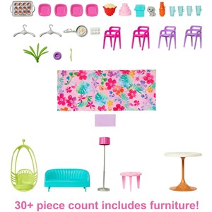 وقتی داستان پردازیهای هیجانانگیز وارد این خانهی عروسکی 2 طبقه میشود، فرصتهای بیپایانی برای بازی با شش قسمت شامل اتاق خواب، حمام، آشپزخانه، غذاخوری، اتاق نشیمن و بخش مخصوص لباس را به شما میدهد. این خانه با طراحی مدرن، شیک و ویژگیهای جالب دری را به سوی سرگرمیهای خیالی باز میکند، مانند یک صندلی متحرک که به عنوان آسانسور عمل میکند و دیواری که بالا و پایین میرود تا بتوانید صحنه را برای یک شب فیلم یا جشن تولد تنظیم کنید! این مجموعهی بازی با بیش از 30 اکسسوری از جمله یک حیوون خونگی و مبلمان راحتی، خونهای رویایی برای کودکان خلاق و رویاپرداز به شمار میرود.