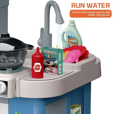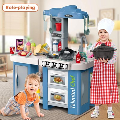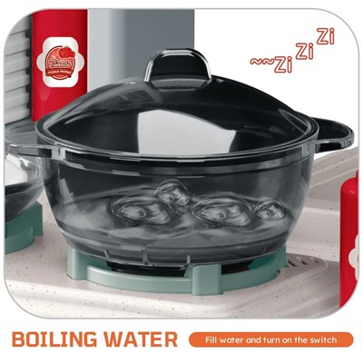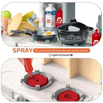 کودکان بیشتر به اسباببازیهایی که شبیه وسایل خانه هستند علاقه دارند، زیرا خود را مادرشان میدانند و این برایشان بسیار جذاب است. یکی از این اسباب بازی های مهیج دخترانه ست آشپزخانه کودک چراغ دار می باشد که مجموعه ای از وسایل آشپزخانه کودکان شامل گاز و وسایل آشپزخانه مانند قابلمه، چنگال، قاشق، کفگیر، انواع ظروف، فنجان و … می باشد تا زمانی که آشپزخانه کامل شود. این ست آشپزخانه اسباب بازی کودک چراغ دار دارای محل آویزان وسایل و قابلیت بازکردن در فر و چرخاندن دسته گاز می باشد. در این ست آشپزی در کابینت ها باز و بسته می شوند و گاز دارای جلوه های نوری و صوتی جذاب می باشد و با چرخاندن آنها چراغ زیر شعله گاز روشن میشود با ریختن کمی آب درون شعله گاز بخار آب تولید می شود که نقش پذیری و داستان سرایی را برای کودک دو برابر می کند. با روشن شدن چراغ صدا نیز به گوش میرسد که حس خوب آشپزی و خاله بازی را به کودک میدهد. شیر آب آشپزخانه اسباب بازی کودک با کمک 3 عدد باتری قلمی قابل استفاده است و قابلیت ریزش آب دارد. به اجاق آن 3 عدد باتری قلمی میخورد که دارای صدای بخار و نور قرمز برای واقعی جلوه دادن آشپزی کودکان است. آشپزخانه کودک بزرگ موزیکال دارای چندین قابلیت فوق العاده میباشد که کودکان و حتی بزرگسالان را به وجد می آورد. این آشپزخانه کودک تمامی امکانات و انواع اسباب بازی وسایل آشپزخانه که کودکان دوست دارند را در خود جای داده است. درون گاز آب بریزید تا شاهد بخار کردن گاز بشید و حس واقعی آشپزی رو تجربه کنید.