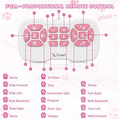 این گربه کوچولو رباتیک عاشق بازی و سرگرمی است و دوست دارد همش این ور و آن ور برود، آماده اید تا یک روز هیجان انگیز و پر از شادی را با این ربات کنترلی گربه مهربون بگذرانید؟ در دنیا تکنولوژی هیچ چیزی به اندازه یک ربات گربه کنترلی خانگی بچه ها را به وجد نمی آورد. بر روی سر ربات گربه یک حسگر وجود دارد که می توان حرکت ربات را کنترل کند. بر روی ریموت کنترل ربات گربه کلید های مختلفی وجود دارد که هر یک کارایی خاصی دارد که علاوه بر کلید های حرکت، دو کلید حالت دمو نیز وجود دارد. اگر سر این گربه رباتیک ملوس را ناز کنید صدای میو میو می دهد. او به عقب، جلو، چپ و راست می رود و به راحتی با کنترل هدایت می شود. ریموت کنترل گربه اسباب بازی کنترلی با دو عدد باتری نیم قلمی کار می کند و خود ربات گربه نیز از یک باتری قابل شارژ انرژی می گیرد و یک شارژ نیز برای شارژ کردن باتری وجود دارد.