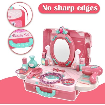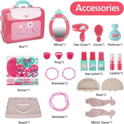 دختر بچه ها اغلب از تماشای آرایش مادرشان لذت می برند و رویای داشتن وسایل آرایش زیبایی مانند آنها و استفاده از آنها را در سر می پرورانند. با این ست اسباب بازی آرایشی، کودک شما از اینکه لباس یک شاهزاده خانم زیبا بپوشد، خوشحال می شود. میز آرایشی زیبا در یک کیف کاربردی ، تضمینی است که همه دختر بچه هایی را که دوست دارند موهایشان را شانه کنند ، خوشحال می کند. این ست اسباب بازی همه چیزهایی را که دختر خانم های کوچک برای لباس پوشیدن کامل نیاز دارند ، فراهم می کند.