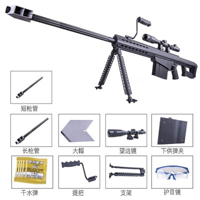 - دارای : دوربین قابل نصب و تنظیم زوم و لیزر جانبی، 12 بسته تیر ژله ای (500 عدد هر بسته)، کابل شارژ USB، بند کمری و عینک محافظ