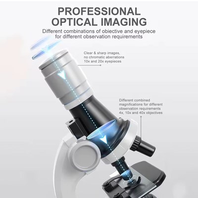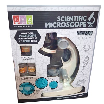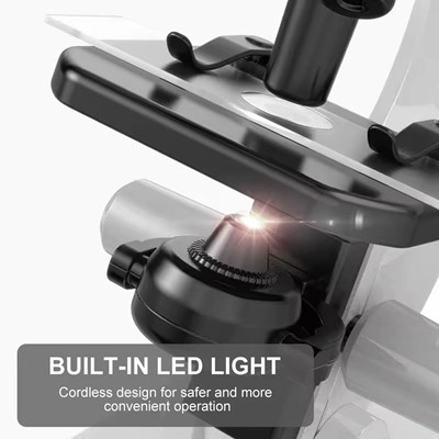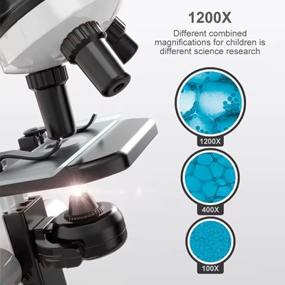 میکروسکوپ آموزشی چراغ‌دار با بزرگنمایی ۱۰۰ تا ۱۲۰۰ برابر، گزینه‌ای مناسب برای آموزش و کشف دنیای زیست‌شناسی به کودکان است. این مدل دارای عدسی چشمی 10x و 20x و لنز شیئی 4x، 10x و 40x بوده و امکان تنظیم بزرگنمایی در سه سطح 100X، 400X و 1200X را فراهم می‌کند. نور LED با زاویه قابل تنظیم، مشاهده‌ی نمونه‌ها را شفاف‌تر و دقیق‌تر می‌سازد. درون بسته یک نمونه آماده، دو لام میکروسکوپ، چهار ابزار علمی، دو بطری جمع‌آوری و یک جعبه‌ی نمونه وجود دارد. بدنه از پلاستیک ABS مقاوم و قطعات الکترونیکی باکیفیت ساخته شده است. این میکروسکوپ با دو عدد باتری قلمی (شامل جعبه نیست) کار می‌کند و برای کودکان بالای ۶ سال مناسب است.