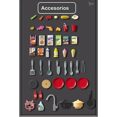 - دارای مجموعهای متنوع از لوازم خوراکی شامل میوهها، سبزیجات و ظروف آشپزخانه