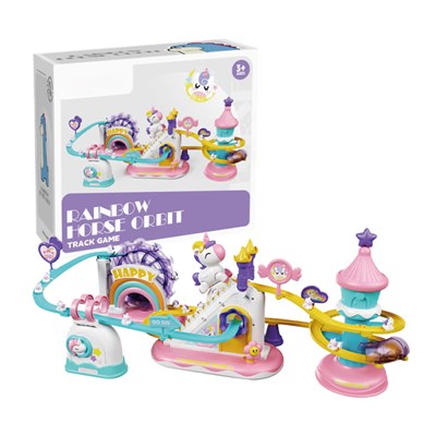 این اسباببازی جذاب با طراحی خلاقانه و ویژگیهای سرگرمکننده خود، دنیایی از هیجان و شادی را برای کودکان به ارمغان میآورد. مجموعه شامل پله برقی موزیکال و چراغدار و یک چرخ و فلک نورانی با قابلیت چرخش است که به کمک اسب های تک شاخ کوچک، بازی را برای کودک شما به تجربهای پویا و مهیج تبدیل میکند. اسب های تک شاخ از پلههای متحرک بالا میروند و سپس از سرسره سر میخورند، در حالیکه چراغهای رنگی و موسیقی شاد، فضایی پرانرژی ایجاد میکنند.