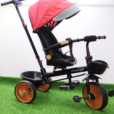 سه‌چرخه فلزی با سایه‌بان، محصولی کاربردی، ایمن و راحت برای کودکان بالای یک سال است که با طراحی مدرن و امکانات کامل، تجربه‌ای دلپذیر برای کودک و والدین فراهم می‌کند. این سه‌چرخه با ارتفاع ۴۰ سانتی‌متر از زمین تا نشیمنگاه و طول کلی ۸۲ سانتی‌متر طراحی شده و بدنه‌ای فلزی و مقاوم دارد.فرمان سه‌چرخه قابلیت خوابیدن و کنترل از روی دسته پشت را دارد و دسته پشتی دو‌تکه با امکان تنظیم ارتفاع، والدین را قادر می‌سازد تا متناسب با قد خود، کنترل راحت‌تری داشته باشند. همچنین، وجود جا لیوانی روی دسته باعث می‌شود نوشیدنی یا وسایل کوچک همیشه در دسترس باشد.صندلی سه‌چرخه از پلاستیک مقاوم با روکش نرم ساخته شده و قابلیت چرخش در چهار جهت مختلف و تنظیم به سمت مادر را دارد تا تعامل و ارتباط کودک با والدین آسان‌تر شود. این صندلی مجهز به دسته محافظ ایمن و کمربند ایمنی سه‌تکه است که از افتادن یا لغزش کودک جلوگیری می‌کند.در قسمت جلو، سبد و جاپایی قابل جدا شدن طراحی شده و در بخش عقب نیز جای بار کاربردی برای حمل اسباب‌بازی یا وسایل کودک وجود دارد. سایه‌بان سه‌چرخه به‌صورت قابل باز و بسته شدن طراحی شده و در صورت نیاز نیز به‌راحتی جدا می‌شود تا در شرایط مختلف آب‌وهوایی بتوان از آن استفاده کرد.لاستیک‌های اسفنجی فشرده این مدل حرکت نرم و بی‌صدا روی سطوح مختلف را ممکن می‌سازد و در کنار بدنه فلزی مستحکم، دوام و کیفیت بالای محصول را تضمین می‌کند. این سه‌چرخه انتخابی عالی برای خانواده‌هایی است که به دنبال ترکیب امنیت، راحتی و طراحی زیبا برای کودک خود هستند.