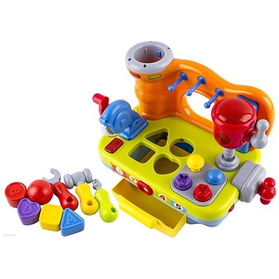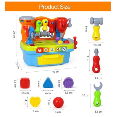 این میز ابزار کوچک به صورت یک میز مینی است و دارای یک چکش، آچار و پیچ گوشتی می باشد.میز ابزار آموزشی یک چرخ دنده کوچک دارد که با فشردن آن چراغی در قسمت پایین روشن می شود و چرخ دنده شروع به حرکت می کند.در قسمت راست این میز یک پیچ قرار دارد که با پیچاندن آن قسمتی از کار چون به صورت اهرمی است، بیرون می آید. یک پیچ پرس بر روی میز وجود دارد که با ضربه زدن به آن کار پرس، انجام می شود و در هنگام حرکت پیچ، چراغ آن روشن و صدا پخش می شود.بر روی میز دکمه های متعددی قرار دارد و اشکال مثلث، مربع، دایره و قلب برای آموزش کودک وجود دارد که باید در قالب خود قرار بگیرد. یک توپ کوچک برای ورود به یک حفره قرار دارد که در هنگام انداختن توپ، آهنگ به صدا در می آید و چراغ های آن به صورت گردان روشن می شود.شما می توانید با این وسیله رنگ ها، اشکال اصلی هندسی، تجهیزات ساده جعبه ابزار و اعداد انگلیسی را به کودک خود آموزش دهید.اسباب بازی زیبا جنبه آموزشی دارد و سبب تقویت هوش، قوه شنیداری و دیداری می شود.کوچولو دلبند شما حتی بدون استفاده از باتری هم می تواند از این اسباب بازی شگفت انگیز استفاده کند.اسباب بازی زیبا با دو عدد باتری AA راه اندازی می شود.